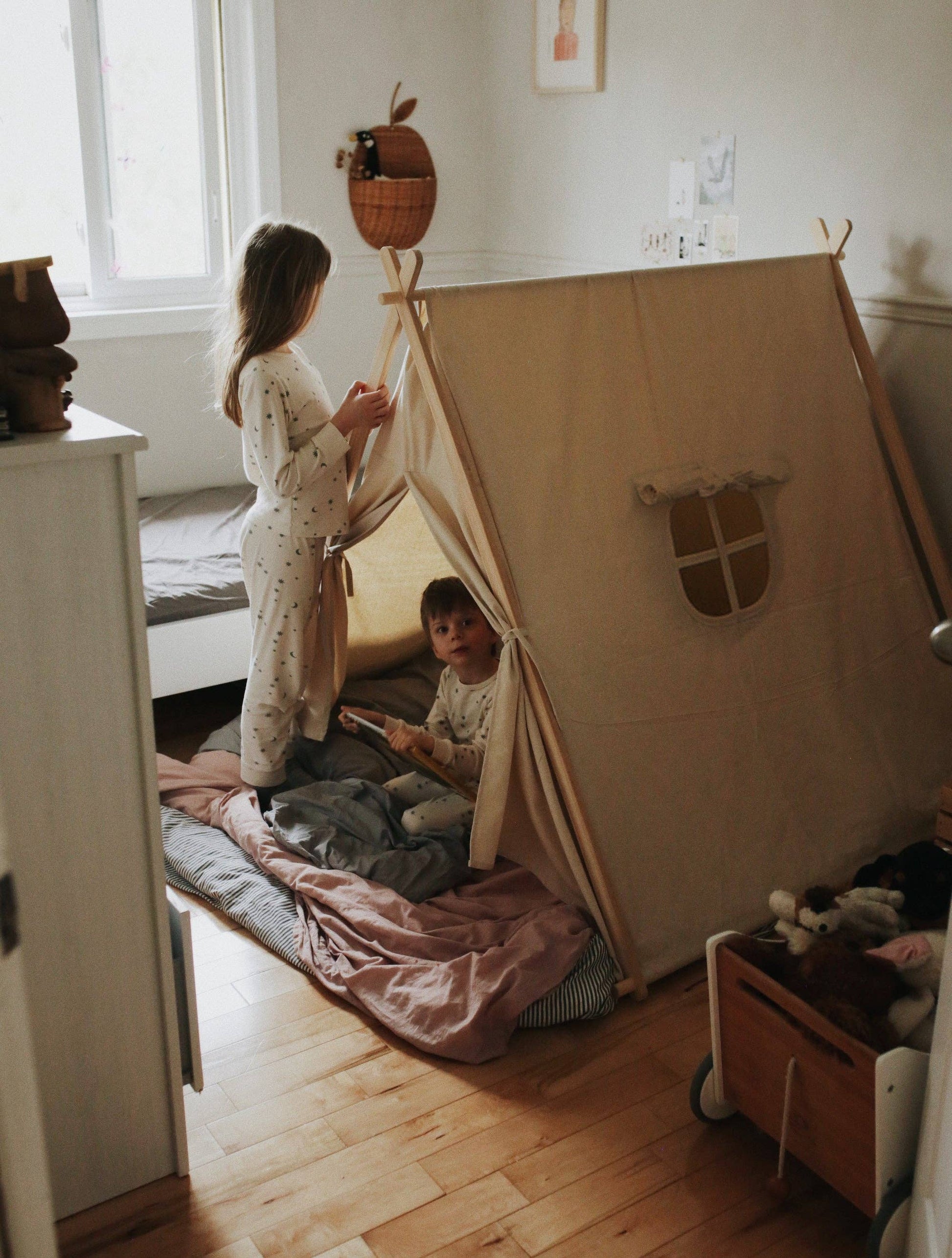 Explore a world of adventure with the kinderfeets tent! Crafted using sustainable New Zealand pine wood and natural cotton fabric, the tent inspires fantasy play and supports a wide range of cognitive developmental areas.